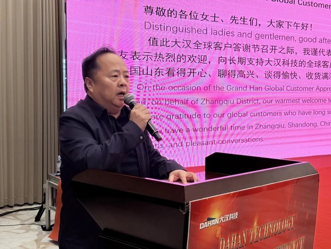 章丘區(qū)貿(mào)促會黨組書記、會長高國慶也蒞臨會場,高書記在會上說大漢科技作為本土標桿企業(yè),深耕技術(shù)創(chuàng)新、堅守品質(zhì)承諾,在全球市場中穩(wěn)步前行,其成長離不開全球客戶的信任與支持。當前,數(shù)字貿(mào)易、綠色發(fā)展成為全球經(jīng)貿(mào)合作新引擎,貿(mào)促會將持續(xù)提供展會對接、商事服務、權(quán)益保障等全方位支持,助力大漢科技與各位伙伴深化合作、共拓新局。我們堅信,以誠信為基、以創(chuàng)新為翼,大漢科技必將與全球客戶實現(xiàn)更高水平的互利共贏。