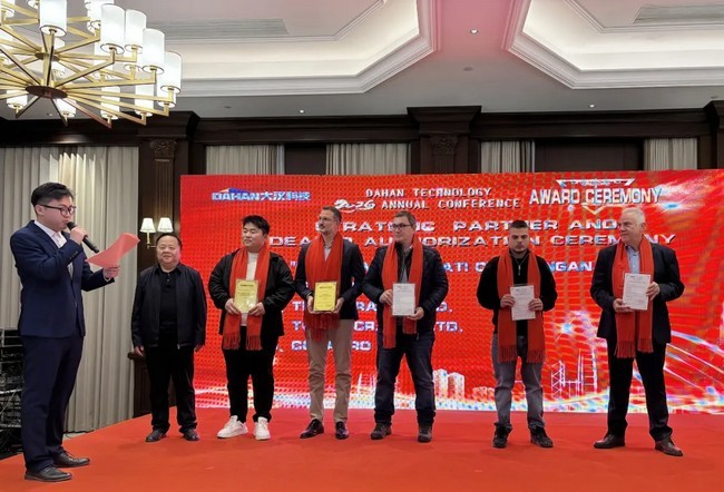在頒獎環(huán)節(jié),大漢科技對甄出的全球11家戰(zhàn)略客戶和大客戶經(jīng)銷商頒發(fā)了獎牌。