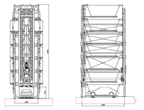 PCX垂直循環(huán)類停車設備是采用垂直方向做循環(huán)運動,通過專業(yè)電機帶動傳動機構(gòu),在牽引鏈條上,每隔一定距離安裝一個存車托架,存車托架隨鏈條一起作循環(huán)運動,從而達到存取車的一種機械式停車設備。